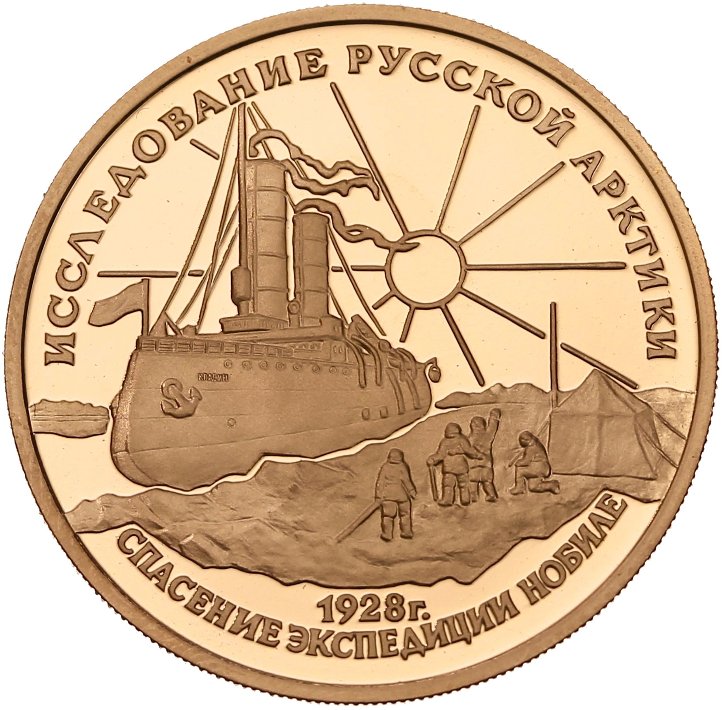 Описание: У центрі — криголам «Красін», праворуч — група людей і намет на крижині, знизу — дата «1928 г.», написи по краю: зверху — «ИССЛЕДОВАНИЕ РУССКОЙ АРКТИКИ» (ДОСЛІДЖЕННЯ РОСІЙСЬКОЇ АРКТИКИ), знизу - «СПАСЕНИЕ ЭКСПЕДИЦИИ НОБИЛЕ» (РЯТУВАННЯ ЕКСПЕДИЦІЇ НОБІЛЕ).
