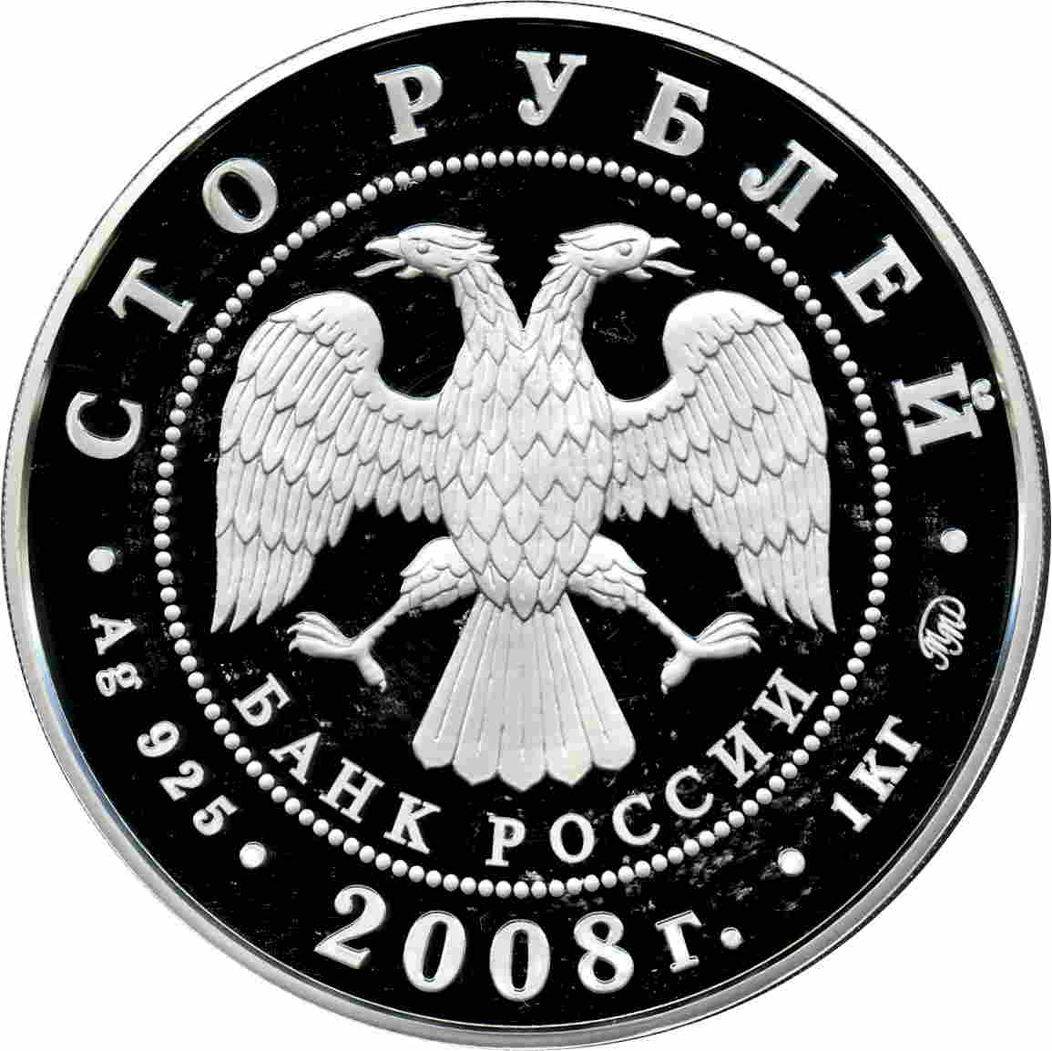 Описание: У центрі — емблема Банку Росії [двоголовий орел із опущеними крилами, під ним — напівкруглий напис «БАНК РОССИИ» (БАНК РОСІЇ)], обрамлена колом з крапок, а по краю — написи: зверху: «СТО РУБЛЕЙ» (СТО РУБЛІВ), нижче: ліворуч - позначення дорогоцінного металу та його проби, в центрі - рік випуску «2008 г.» (2008), праворуч - вміст дорогоцінного металу та знак монетного двору.