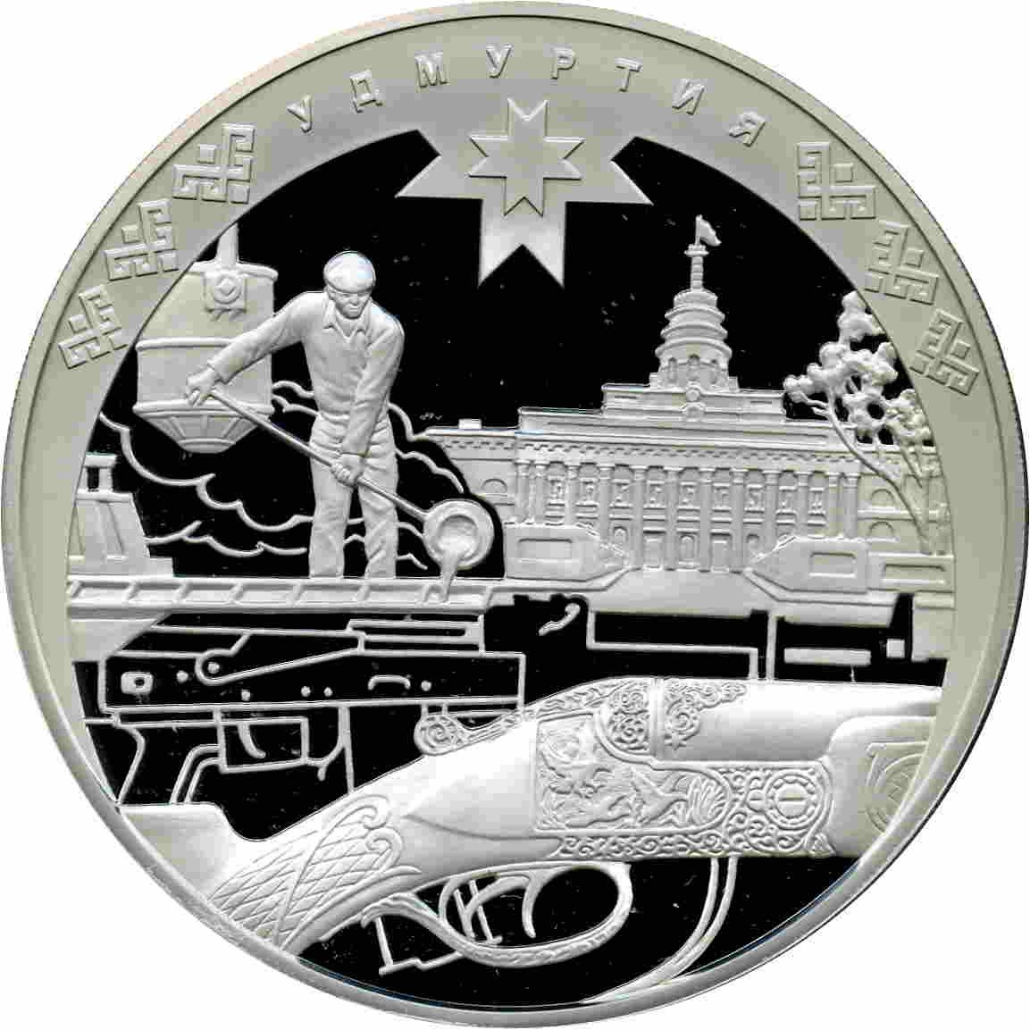 Описание: У картуші ліворуч — металург за роботою, праворуч — головна будівля колишнього Іжевського заводу стрілецької зброї, знизу — фрагмент рушниці для полювання на птахів з різьбленим орнаментом, за нею — контурне зображення пістолета-кулемета Калашникова, зверху на матовому картуші з орнаментом — восьмипроменевий сонячний знак і напис по краю — «УДМУРТІЯ».