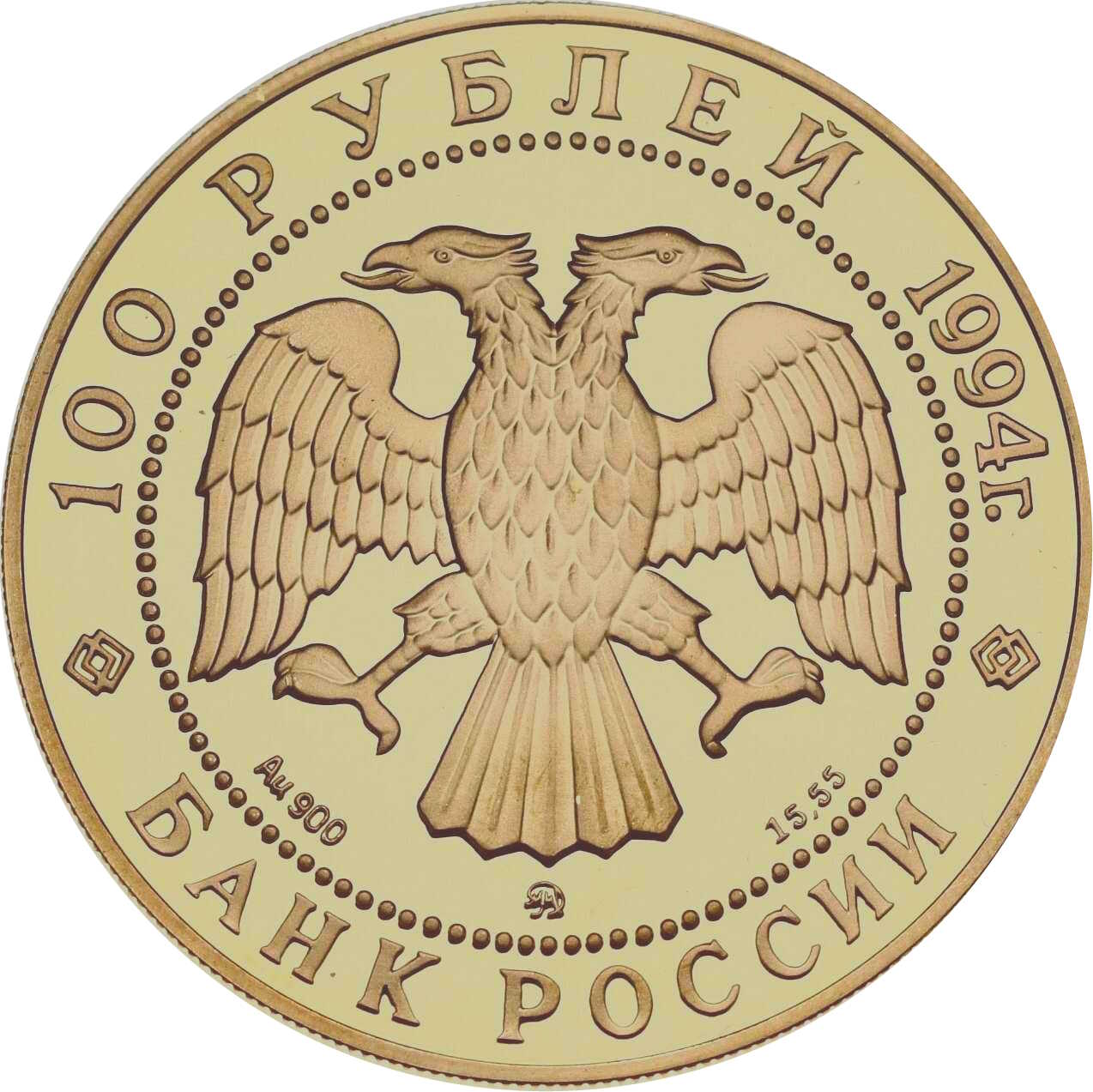 Описание: Двоголовий орел (дизайн І. Білібіна), літери під ним позначають метал, пробу, знак монетного двору та вміст дорогоцінного металу. Написи по краю: зверху — «100 РУБЛЕЙ 1994 г.» (100 РУБЛІВ 1994), знизу — «БАНК РОССИИ» (БАНК РОСІЇ).