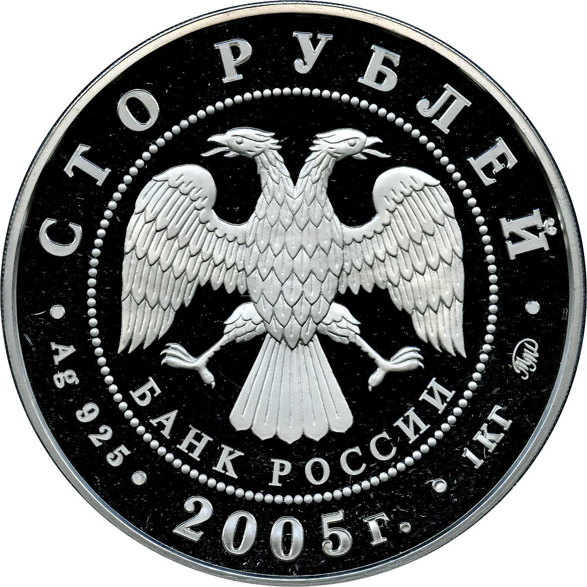 Описание: У центрі — емблема Банку Росії [двоголовий орел із опущеними крилами, нижче — напівкруглий напис — «БАНК РОССИИ» (БАНК РОСІЇ)] в обрамленні кола з крапок і написів по краю: зверху — «СТО РУБЛЕЙ» (СТО РУБЛІВ), внизу – рік випуску «2005», літери ліворуч позначають метал і пробу, праворуч – вміст дорогоцінного металу і знак монетного двору.