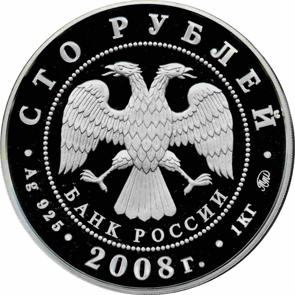 Описание: У центрі — емблема Банку Росії [двоголовий орел із опущеними крилами, під ним — напівкруглий напис «БАНК РОССИИ» (БАНК РОСІЇ)], обрамлена колом з крапок і написів по краю — зверху: «СТО РУБЛЕЙ» (СТО РУБЛІВ), нижче: ліворуч - позначення дорогоцінного металу та його проби, в центрі - рік випуску «2008 г.» (2008), праворуч - вміст дорогоцінного металу та знак монетного двору.