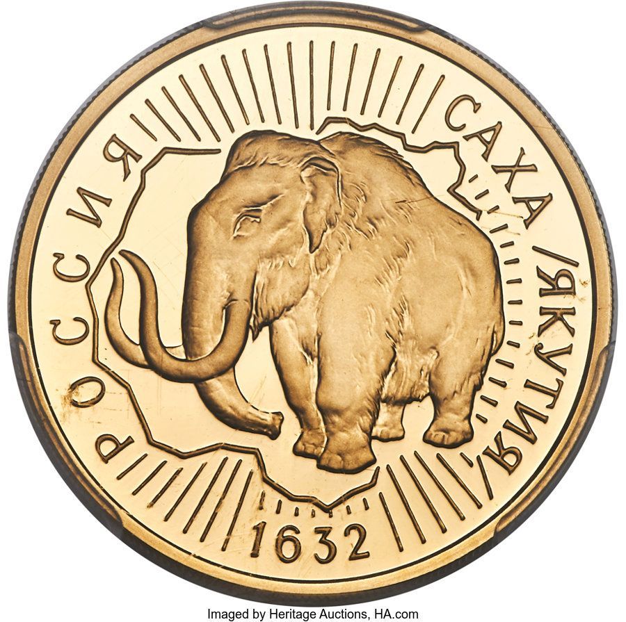 Описание: У центрі диска — рельєфне зображення мамонта на тлі контурної карти Республіки Саха (Якутія), обрамлене променями, що нагадують промені; по краю — напівкруглі написи, ліворуч: «РОССИЯ» (РОСІЯ), праворуч: «САХА/ЯКУТИЯ» (САХА/ЯКУТІЯ), внизу – дата: «1632».