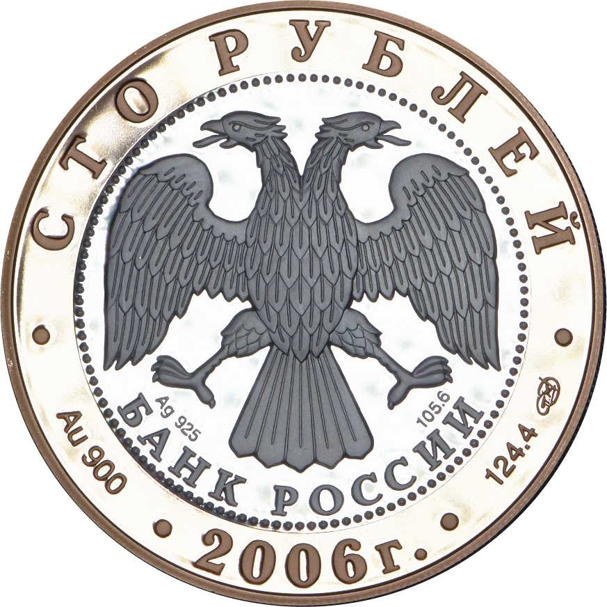 Описание: На диску – емблема Банку Росії [двоголовий орел з опущеними крилами, нижче – напівкругла напис – «БАНК РОССИИ» (БАНК РОСІЇ)] в обрамленні кола з крапок, літери ліворуч позначають метал і пробу, праворуч – вміст дорогоцінного металу. Написи на кільці вздовж краю: вгорі – «СТО РУБЛЕЙ» (СТО РУБЛІВ), внизу – рік випуску «2006», літери зліва вказують на метал і пробу, справа – вміст дорогоцінного металу і знак монетного двору.