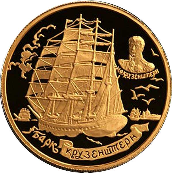 Описание: Барк «Крузенштерн» з корми, вгорі праворуч Њ портрет І.Ф. Крузенштерна з написом по краю «И.Ф. КРУЗЕНШТЕРН» (І.Ф. КРУЗЕНШТЕРН). Напис внизу на стрічці: «БАРК КРУЗЕНШТЕРН» (БАРКА «КРУЗЕНШТЕРН»).