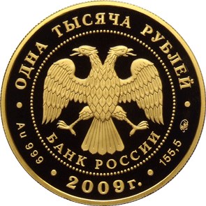 Описание: У центрі — емблема Банку Росії [двоголовий орел із розпростертими крилами, під ним — напівкруглий напис «БАНК РОССИИ» (БАНК РОСІЇ)], обрамлена колом з крапок і написів по краю — зверху: «ОДНА ТЫСЯЧА РУБЛЕЙ» (ОДНА ТИСЯЧА РУБЛІВ), знизу: ліворуч - позначення дорогоцінного металу та його проби, по центру - рік випуску «2009 г.» (2009), праворуч - вміст дорогоцінного металу та знак монетного двору.