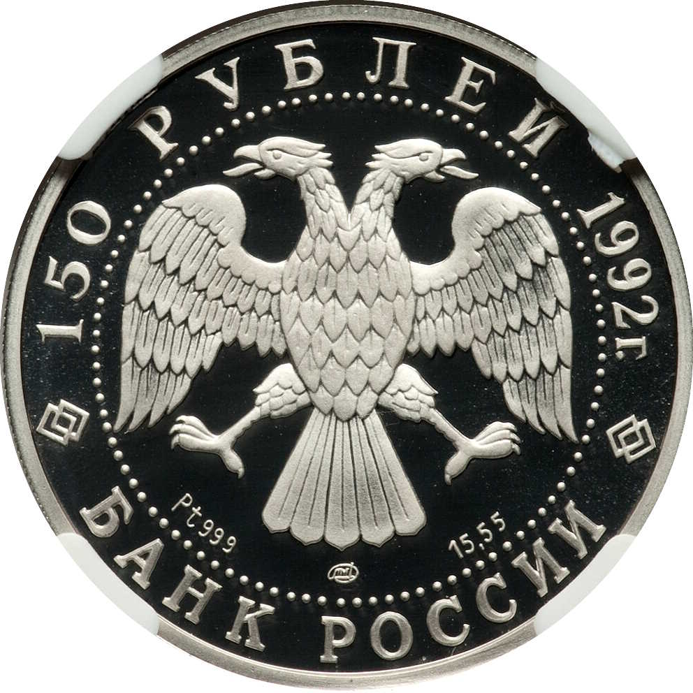 Описание: У центрі диска, в колі з крапками — емблема Банку Росії (двоголовий орел з опущеними крилами), під нею ліворуч — позначення дорогоцінного металу та його проби, в центрі — знак монетного двору, праворуч — вміст дорогоцінного металу; по краю — напівкруглі написи, розділені двома подвійними ромбами, зверху — номінал і рік випуску: «150 РУБЛЕЙ 1992», знизу: «БАНК РОССИИ».