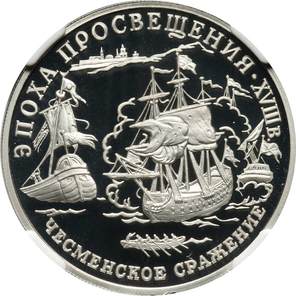 Описание: У центрі диска — рельєфне зображення трьох вітрильних кораблів у хмарах диму та човна в сцені битви, по краю — напівкруглі написи, зверху: «ЭПОХА ПРОСВЕЩЕНИЯ. ХVIII ВЕК» (ЕПОХА ПРОСВІТИ. XVIII СТОЛІТТЯ), нижче: «ЧЕСМЕНСКОЕ СРАЖЕНИЕ» (ЧЕСМЕНСЬКА МОРСЬКА БИТВА).
