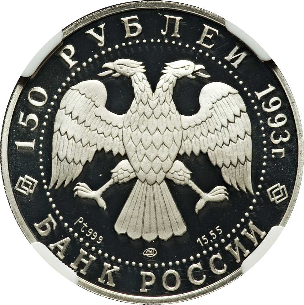 Описание: У центрі — емблема Банку Росії (двоголовий орел, розроблений І. Білібіним), нижче ліворуч — позначка металу та проба, у центрі — знак монетного двору, праворуч — вміст дорогоцінного металу. Написи вздовж обідка обрамлені колом з крапок: зверху — «150 рублів 1993», знизу — «БАНК РОСІЇ».