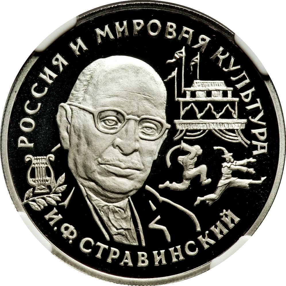 Описание: Зображення Стравінського на тлі сцени з балету «Петрушка», ліворуч — ліра та лавровий гілок, написи вздовж краю: вгорі — «РОСІЯ І СВІТОВА КУЛЬТУРА», внизу — «Стравінський».