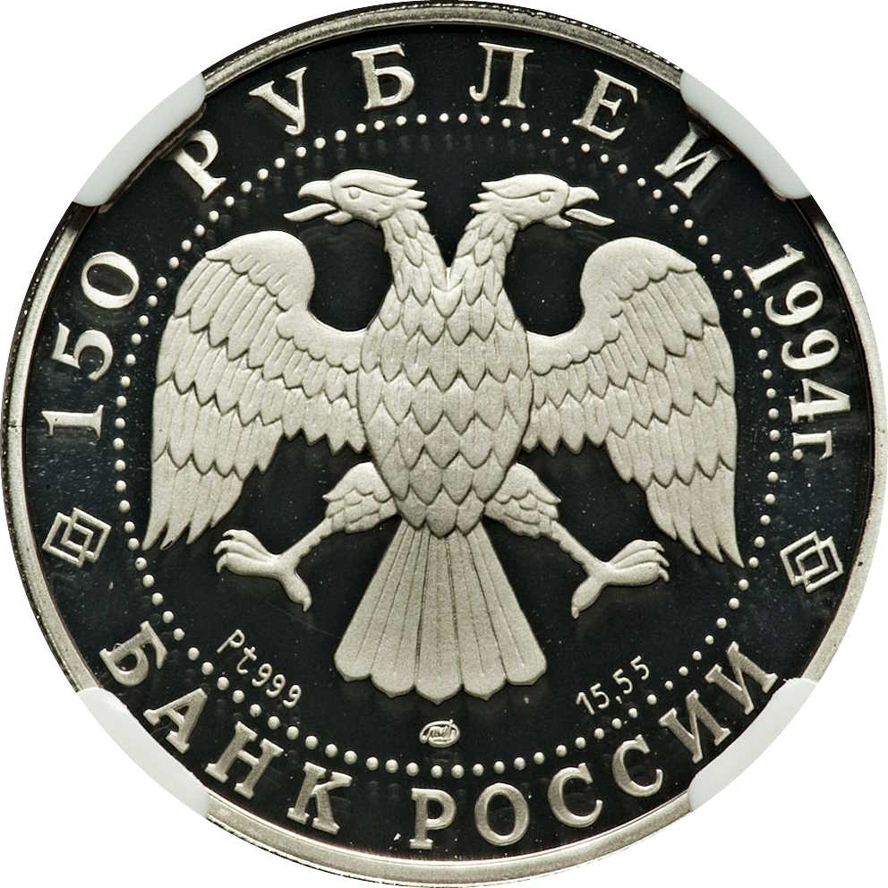 Описание: Двоголовий орел (дизайн І. Білібіна), літери під ним позначають метал, пробу, знак монетного двору та вміст дорогоцінного металу. Написи по краю: зверху — «150 РУБЛЕЙ 1994 г.» (150 РУБЛІВ 1994), знизу — «БАНК РОССИИ» (БАНК РОСІЇ).