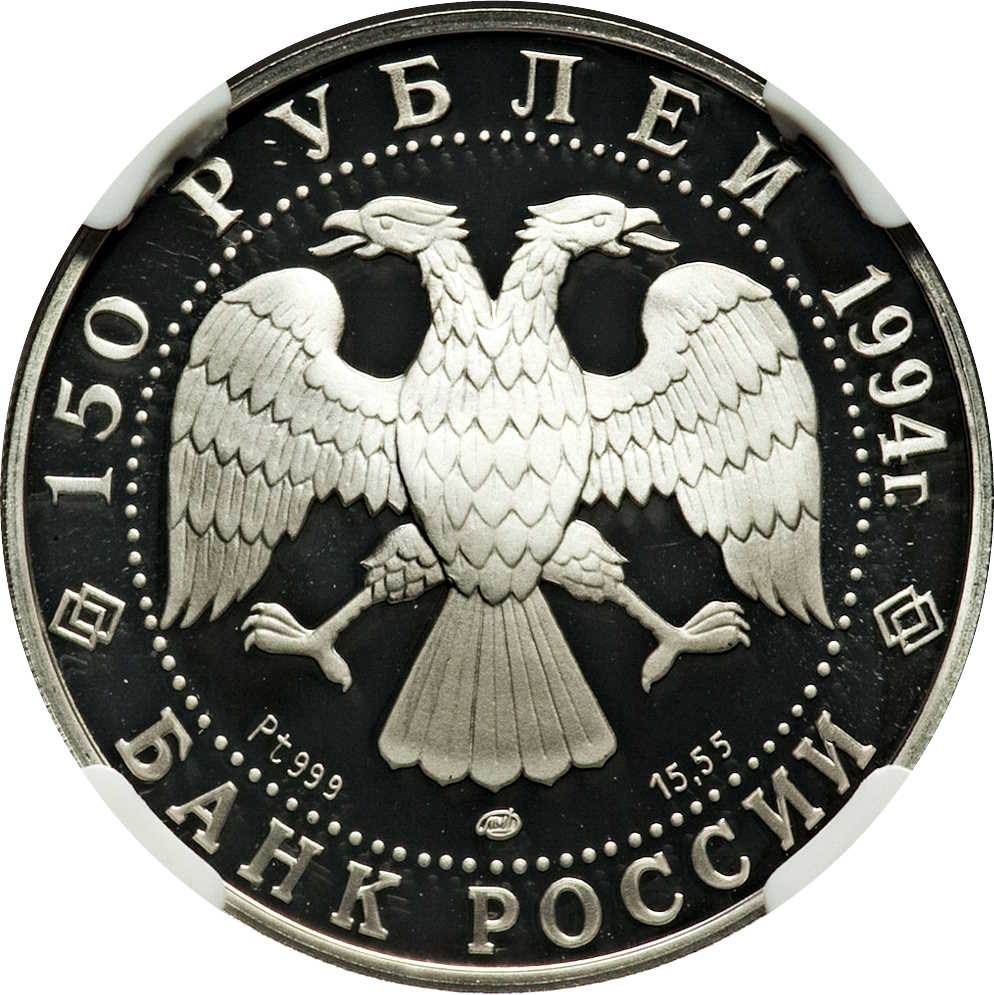 Описание: Двоголовий орел (дизайн І. Білібіна), літери під ним позначають метал, пробу, знак монетного двору та вміст дорогоцінного металу. Написи по краю: зверху — «150 РУБЛЕЙ 1994 г.» (150 РУБЛІВ 1994), знизу — «БАНК РОССИИ» (БАНК РОСІЇ).