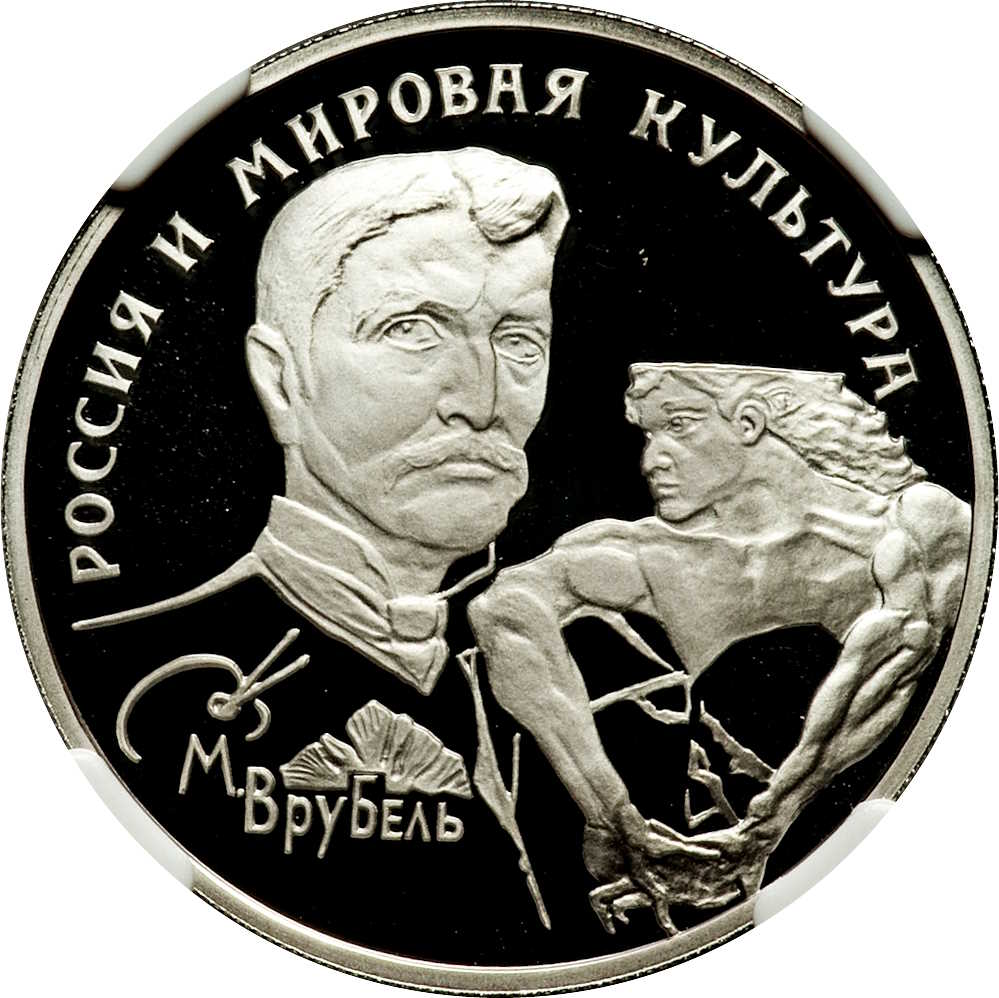 Описание: Зліва — автопортрет Михайла Врубеля, під ним — палітра з пензлями, праворуч — фрагмент картини Врубеля «Демон» (сидячий), написи по краю: зверху — «РОССИЯ И МИРОВАЯ КУЛЬТУРА» (РОСІЯ І СВІТОВА КУЛЬТУРА), знизу — «М. ВРУБЕЛЬ».