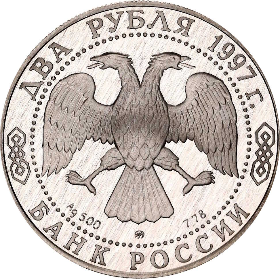 Описание: Двоголовий орел, створений художником І. Білібіним. Написи по краю: зверху — «ДВА РУБЛЯ 1997 г.», знизу — «БАНК РОССИИ». Літери нижче позначають металевий знак, пробу, вміст дорогоцінного металу та знак монетного двору.