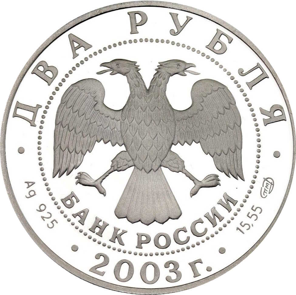 Описание: У центрі — емблема Банку Росії [двоголовий орел із опущеними крилами, нижче — напівкруглий напис «БАНК РОССИИ» (БАНК РОСІЇ)] в обрамленні кола з крапками та написами по краю: зверху — «ДВА РУБЛЯ», внизу — рік випуску «2003», літери ліворуч позначають метал і пробу, праворуч — вміст дорогоцінного металу і знак монетного двору.