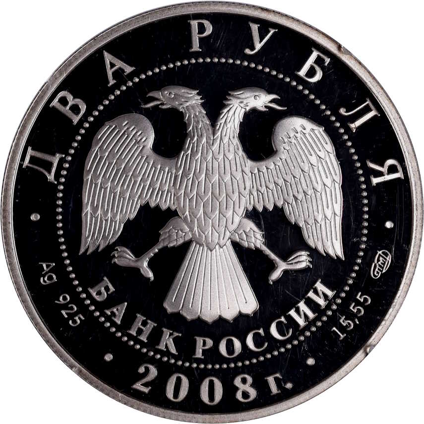 Описание: У центрі — емблема Банку Росії [двоголовий орел із опущеними крилами, під ним — напівкруглий напис «БАНК РОССИИ» (БАНК РОСІЇ)], обрамлена колом з крапок і написів по краю — зверху: «ДВА РУБЛЯ», нижче: ліворуч — позначення дорогоцінного металу та його проби, у центрі — рік випуску «2008 г.», праворуч — вміст дорогоцінного металу та знак монетного двору.