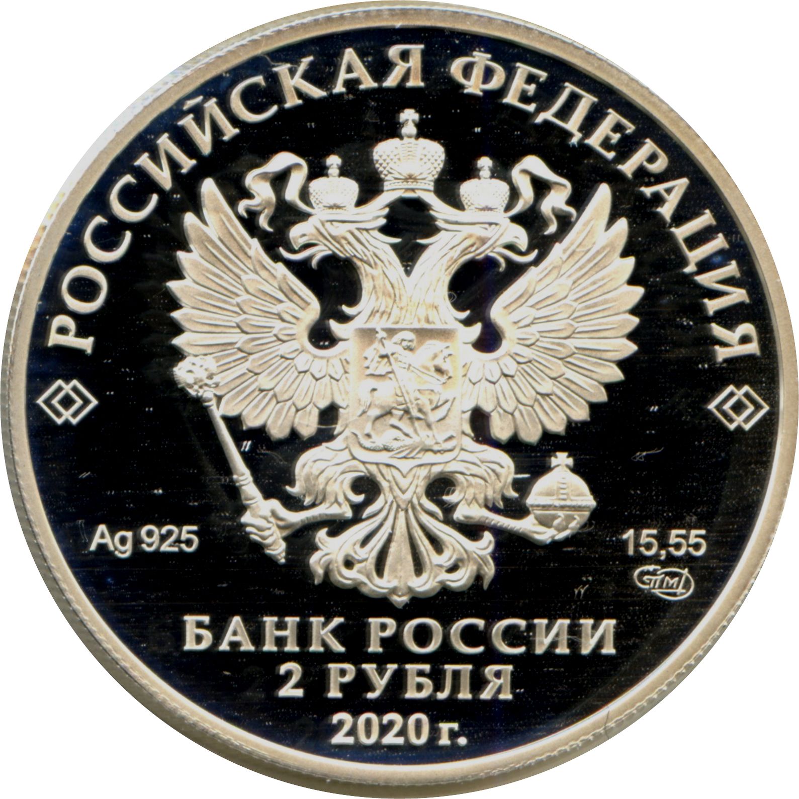Описание: На дзеркальному полі диска – рельєфне зображення Державного герба Російської Федерації, над ним – напівкругла напис по колу: «РОССИЙСКАЯ ФЕДЕРАЦИЯ» (РОСІЙСЬКА ФЕДЕРАЦІЯ), обрамлений з обох боків подвійними ромбами, нижче під гербом: ліворуч – позначення дорогоцінного металу та його проби, праворуч – вміст дорогоцінного металу та знак монетного двору, внизу по центру, у три рядки – напис: «БАНК РОССИИ» (БАНК РОСІЇ), номінал монети: «2 РУБЛЯ» (2 РУБЛІ), рік випуску: «2020 г.» (2020).