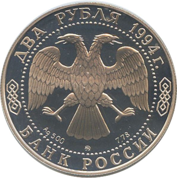 Описание: Двоголовий орел (дизайн І. Білібіна), літери під ним позначають метал, пробу, знак монетного двору та вміст дорогоцінного металу. Написи по краю: зверху — «ДВА РУБЛЯ 1994 г.» (ДВА РУБЛЯ 1994), знизу — «БАНК РОССИИ» (БАНК РОСІЇ).