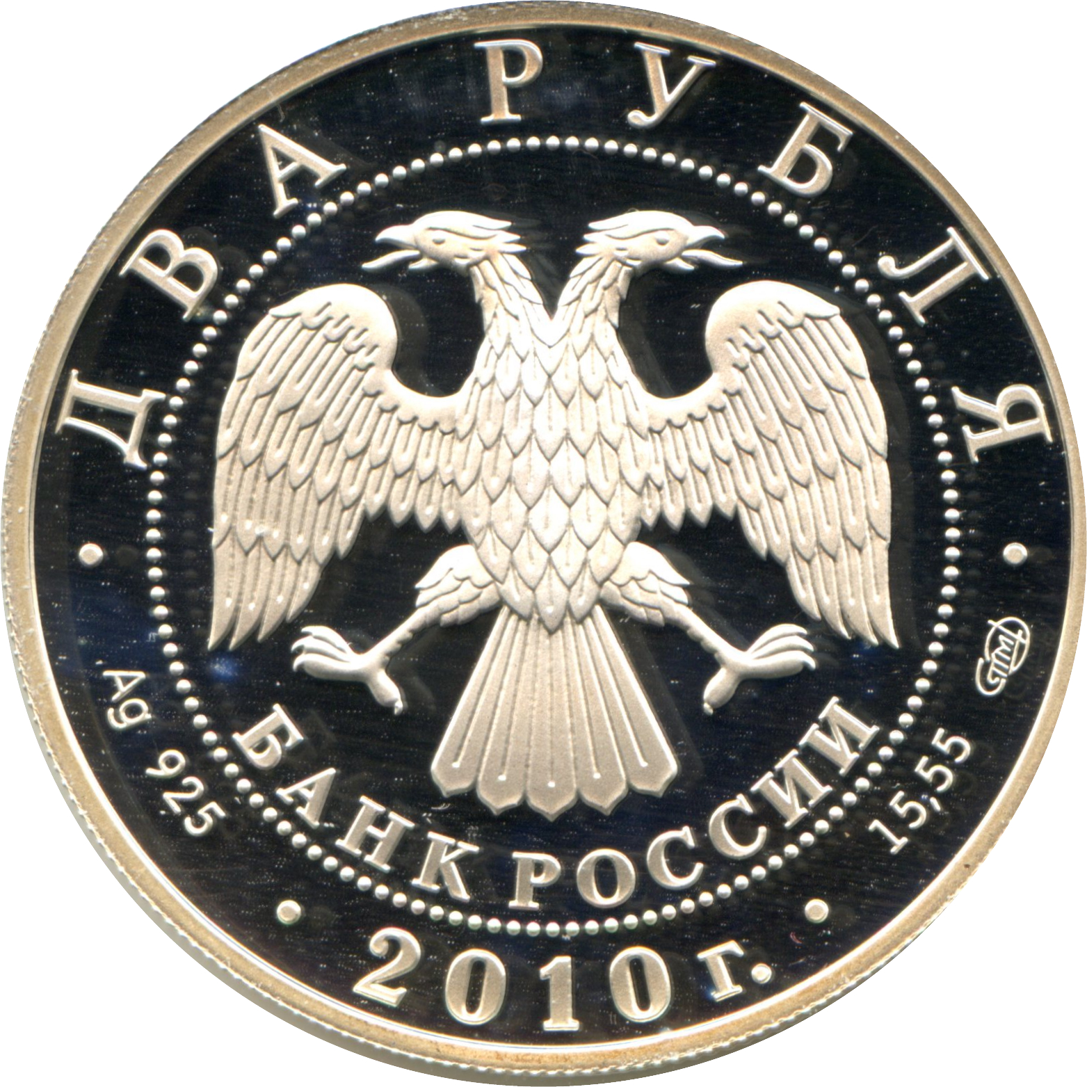 Описание: У центрі — емблема Банку Росії [двоголовий орел із розпростертими крилами, під ним — напівкруглий напис «БАНК РОССИИ» (БАНК РОСІЇ)], обрамлена колом з крапок і написів по краю — зверху: «ДВА РУБЛЯ», нижче: ліворуч - позначення дорогоцінного металу та його проби, у центрі - рік випуску «2010 г.», праворуч - вміст дорогоцінного металу та знак монетного двору.