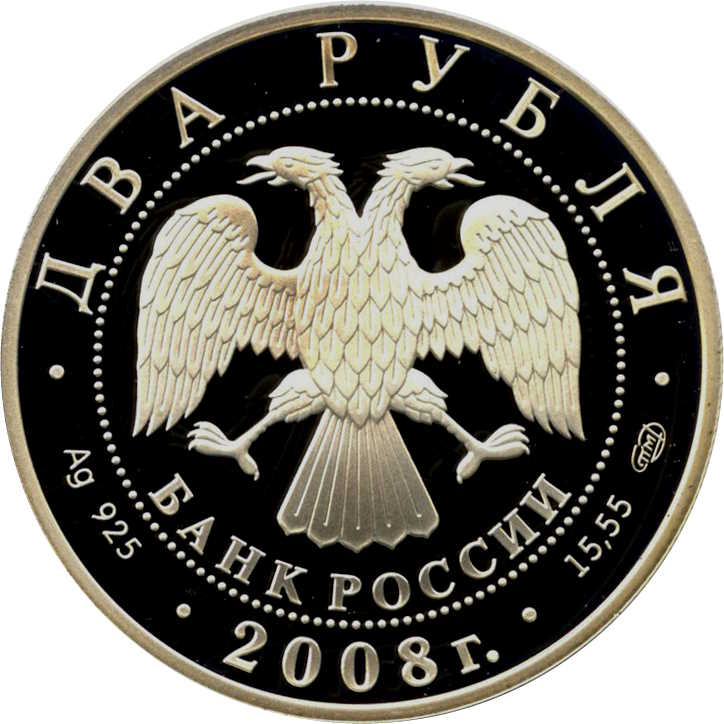 Описание: У центрі — емблема Банку Росії [двоголовий орел із опущеними крилами, під ним — напівкруглий напис «БАНК РОССИИ» (БАНК РОСІЇ)], обрамлена колом з крапок і написів по краю — зверху: «ДВА РУБЛЯ», нижче: ліворуч — позначення дорогоцінного металу та його проби, у центрі — рік випуску «2008 г.», праворуч — вміст дорогоцінного металу та знак монетного двору.