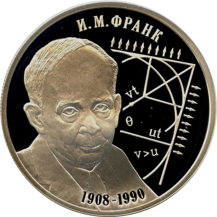 Описание: Зліва — портрет вченого, праворуч — графічна модель випромінювання Вавилова-Черенкова, написи по краю, зверху: «И.М. ФРАНК» (І.М. Франк), знизу — дати: «1908-1990».