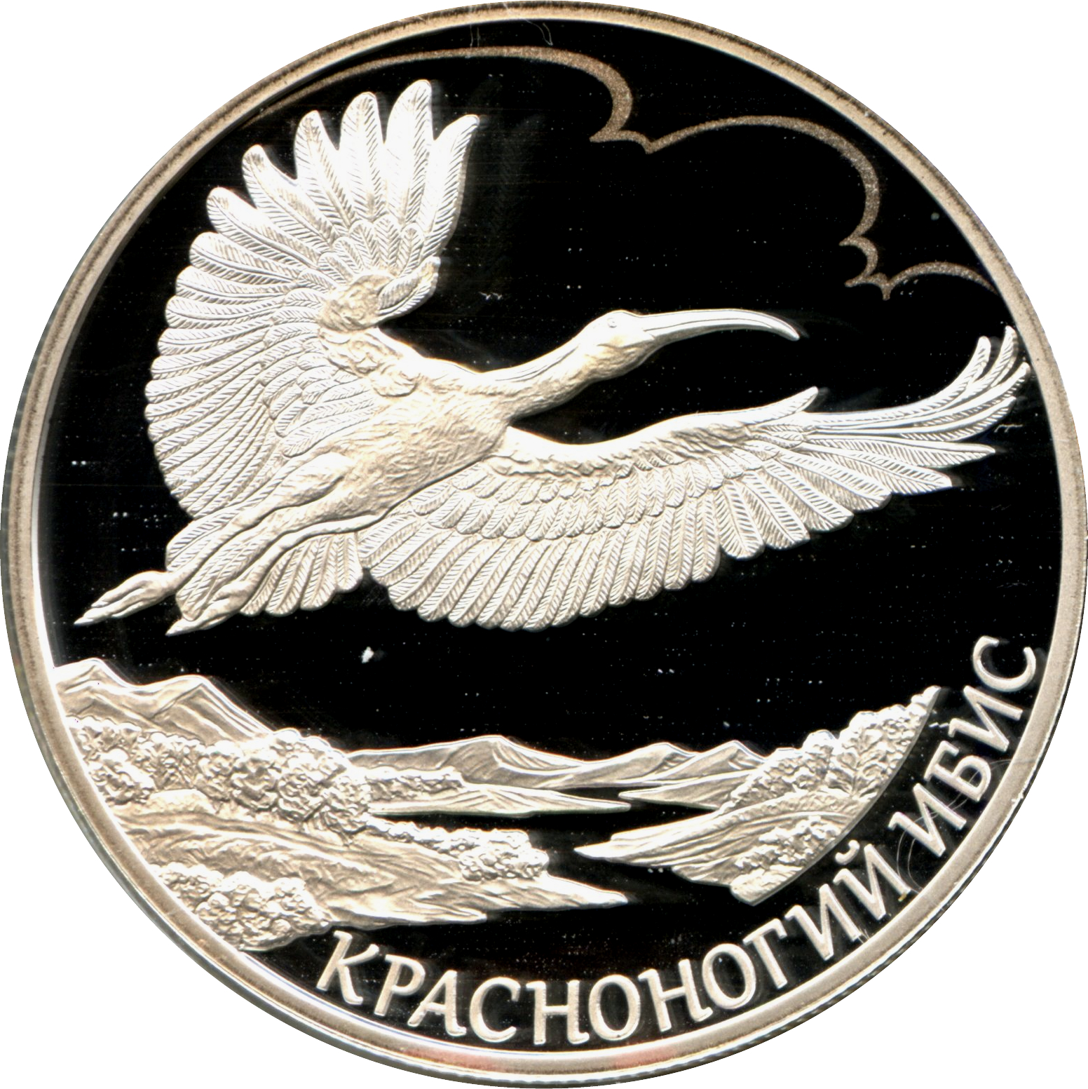 Описание: Рельєфне зображення літаючого японського ібіса; внизу є напівкругла напис: «КРАСНОНОГИЙ ИБИС» (ЯПОНСЬКИЙ ІБІС).