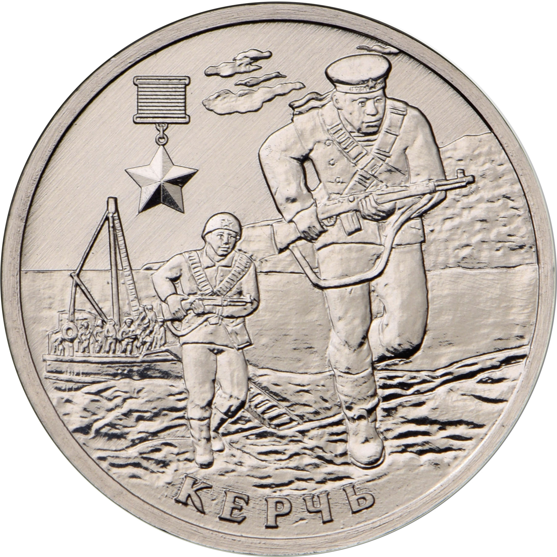 Описание: На зворотному боці монети «Героїчне місто Керч» у центрі зображено висадку в Керчі-Елтигені, у лівій частині — медаль «Золота зірка», а по периметру внизу — напис «КЕРЧ».