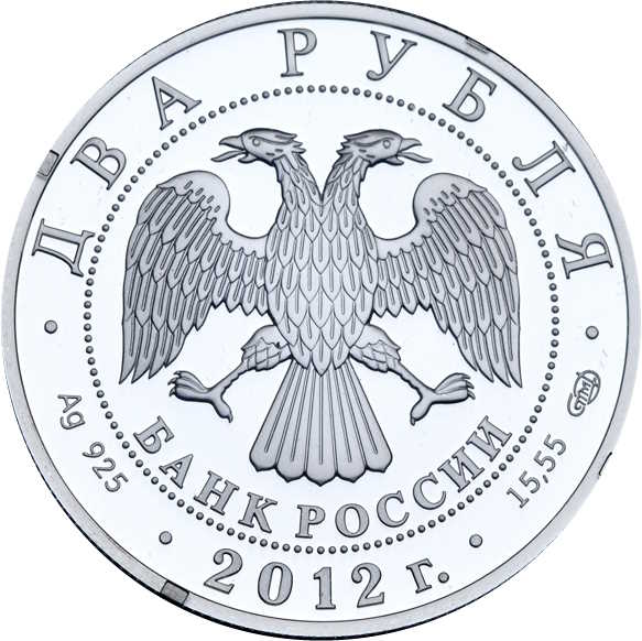 Описание: У центрі — емблема Банку Росії [двоголовий орел із опущеними крилами, під ним — напівкруглий напис «БАНК РОССИИ» (БАНК РОСІЇ)], обрамлена колом з крапок і написів по краю — зверху: «ДВА РУБЛЯ», нижче: ліворуч - позначення дорогоцінного металу та його проби, в центрі - рік випуску «2012 г.», праворуч - вміст дорогоцінного металу та знак монетного двору.