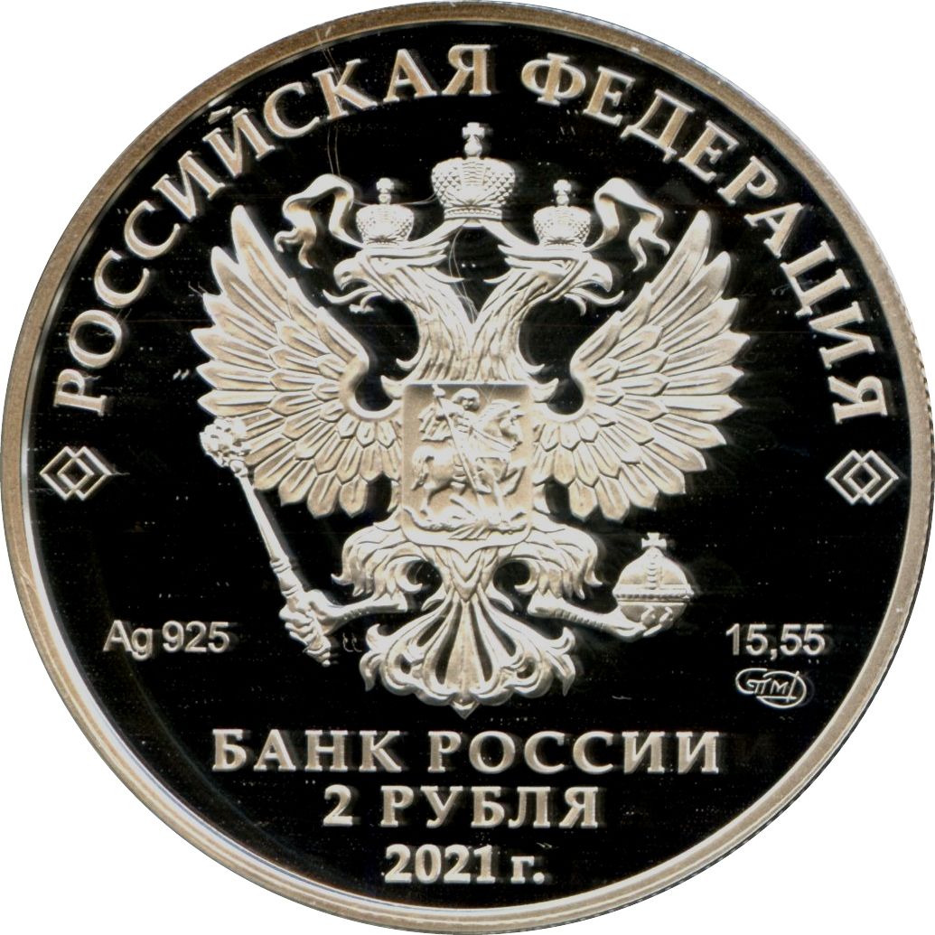 Описание: На дзеркальному полі диска зображено рельєфний герб Російської Федерації, над ним по краю розміщено напівкруглий напис «РОССИЙСКАЯ ФЕДЕРАЦИЯ» (РОСІЙСЬКА ФЕДЕРАЦІЯ), обрамлений з обох боків подвійними ромбами, нижче під гербом зліва вказано дорогоцінний метал і його пробу, а праворуч — вміст дорогоцінного металу та знак монетного двору, внизу по центру трьома рядками розміщено напис «БАНК РОССИИ» (БАНК РОСІЇ), номінал монети «2 РУБЛЯ» (2 РУБЛІ) і рік випуску «2021 г.» (2021).