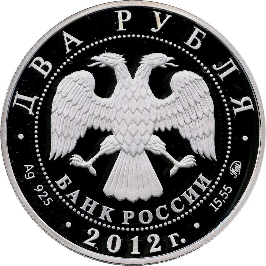 Описание: У центрі — емблема Банку Росії [двоголовий орел із опущеними крилами, під ним — напівкруглий напис «БАНК РОССИИ» (БАНК РОСІЇ)], обрамлена колом з крапок і написів по краю — зверху: «ДВА РУБЛЯ», нижче: ліворуч - позначення дорогоцінного металу та його проби, в центрі - рік випуску «2012 г.», праворуч - вміст дорогоцінного металу та знак монетного двору.