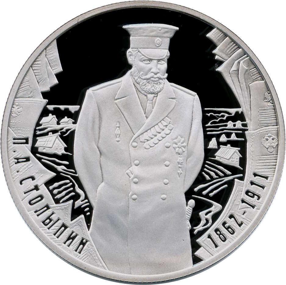 Описание: У центрі на дзеркальній поверхні — портрет П.А. Столипіна у парадній формі на тлі селянських хат, праворуч і ліворуч від портрета вздовж обідка — матові зображення документів на офіційно штампованих паперах, на них знизу ліворуч — напівкруглий напис: - «П.А. СТОЛЫПИН» (П.А. СТОЛЫПИН) праворуч - дати: «1862-1911».