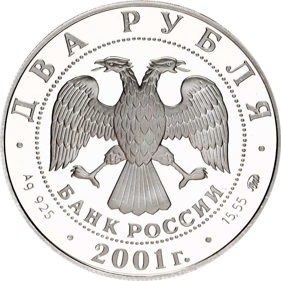 Описание: У центрі — емблема Банку Росії [двоголовий орел із розпростертими крилами, нижче — напівкруглий напис — «БАНК РОССИИ» (БАНК РОСІЇ)] в обрамленні кола з крапками та написами по краю: зверху — «ДВА РУБЛЯ» (ДВА РУБЛЯ), внизу — рік випуску «2001», літери ліворуч позначають метал і пробу, праворуч — вміст дорогоцінного металу і знак монетного двору.