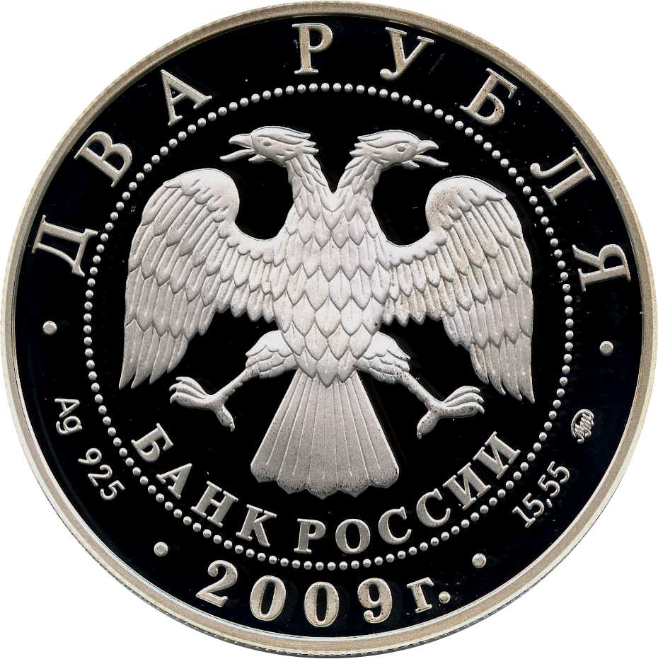 Описание: У центрі — емблема Банку Росії [двоголовий орел із опущеними крилами, під ним — напівкруглий напис «БАНК РОССИИ» (БАНК РОСІЇ)], обрамлена колом з крапок, а по краю — написи: зверху: «ДВА РУБЛЯ», нижче: ліворуч - позначення дорогоцінного металу та його проби, у центрі - рік випуску «2009 г.», праворуч - вміст дорогоцінного металу та знак монетного двору.