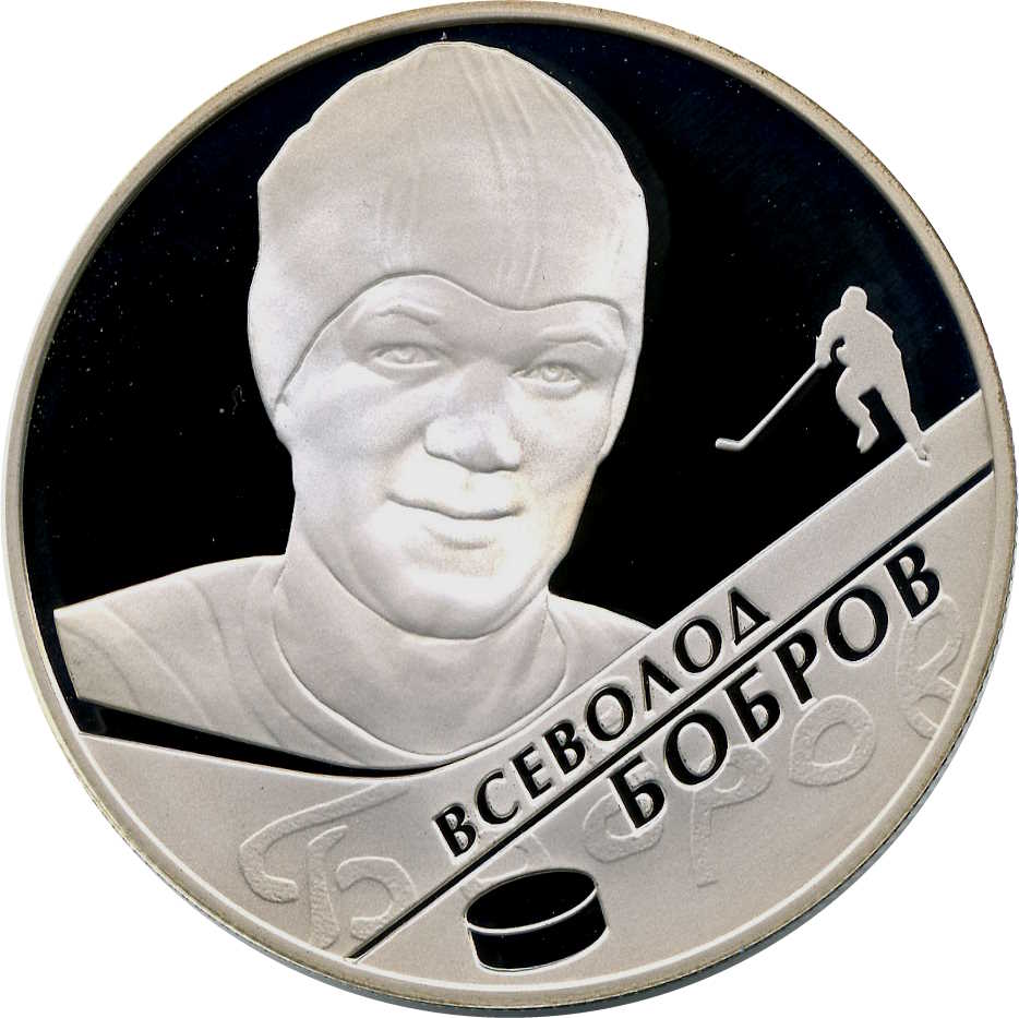 Описание: У центрі — портрет В. М. Боброва, праворуч — мініатюрне зображення хокеїста з ключкою, на матовій поверхні — напис у два рядки, розділені лінією: «ВСЕВОЛОД БОБРОВ» та факсимільний підпис спортсмена, нижче — зображення шайби.