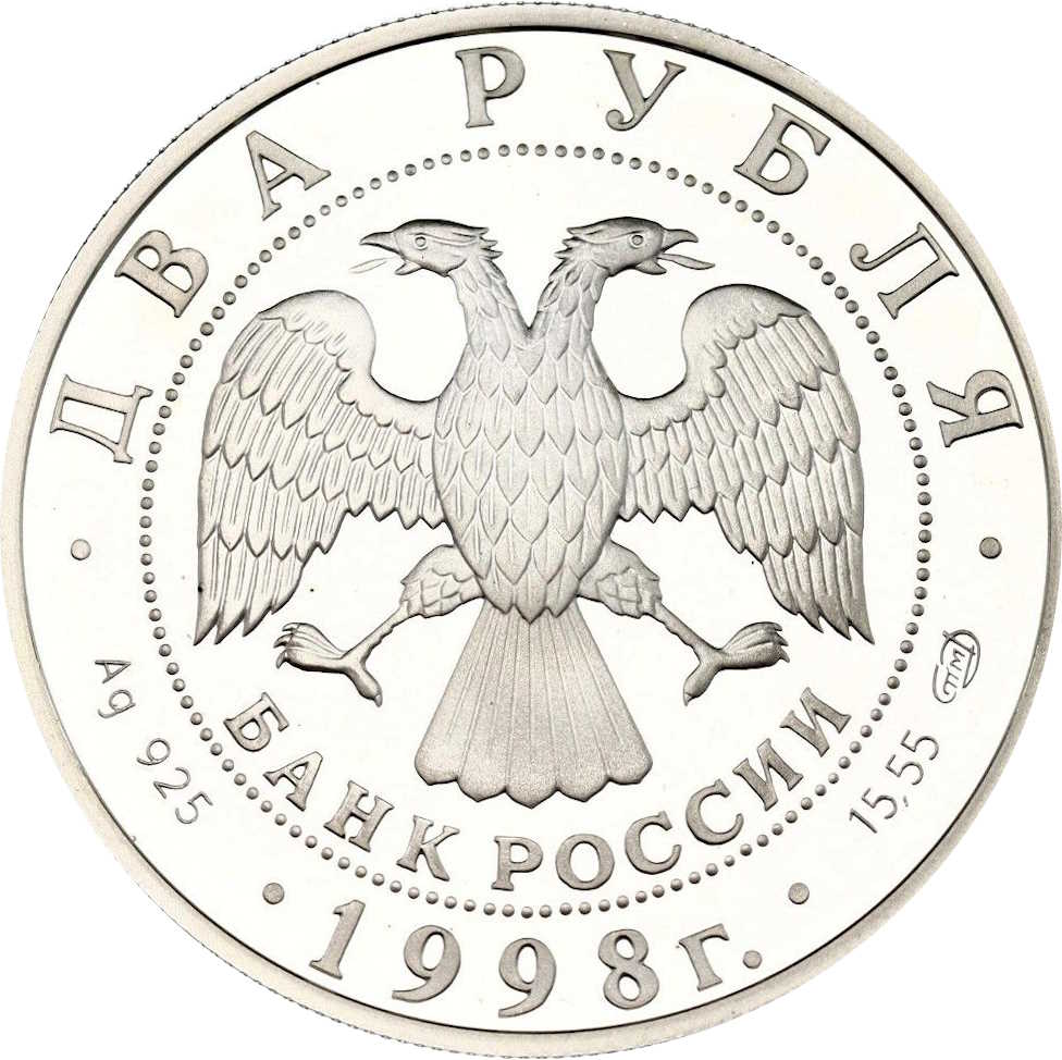 Описание: У центрі — емблема Банку Росії (двоголовий орел, створений І. Білібіним), нижче — напівкругла напис «БАНК РОССИИ» (БАНК РОСІЇ), обрамлена колом з крапок, а по краю — написи: зверху — «ДВА РУБЛЯ» (ДВА РУБЛЯ), внизу — «1998», літери ліворуч позначають метал і пробу, праворуч — вміст дорогоцінного металу і знак монетного двору.