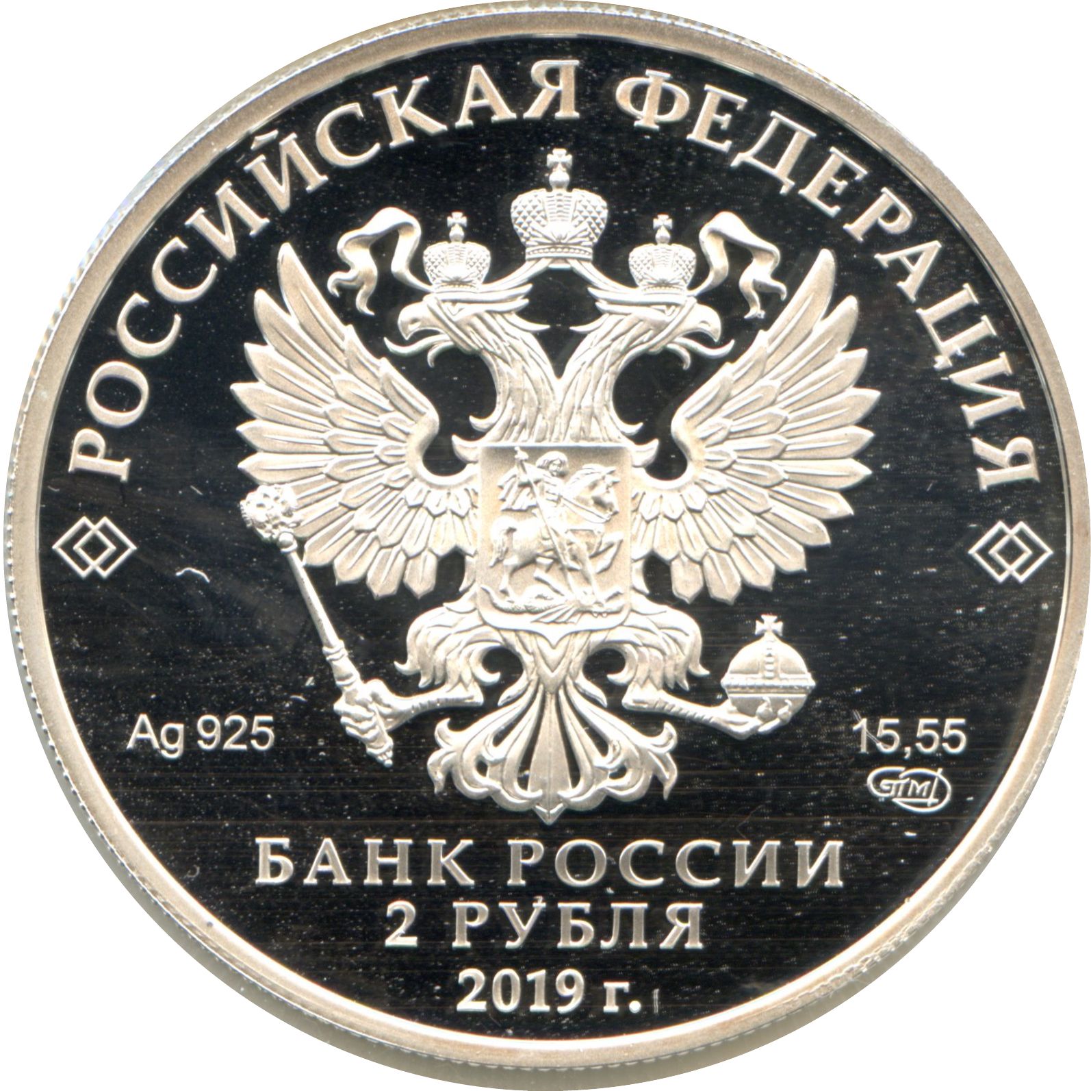 Описание: На дзеркальному полі диска – рельєфне зображення Державного герба Російської Федерації, над ним – напівкругла напис по колу: «РОССИЙСКАЯ ФЕДЕРАЦИЯ» (РОСІЙСЬКА ФЕДЕРАЦІЯ), обрамлене з обох боків подвійними ромбами, нижче під гербом: ліворуч – позначення дорогоцінного металу та його проби, праворуч – вміст дорогоцінного металу та знак монетного двору, внизу по центру, у три рядки – напис: «БАНК РОССИИ» (БАНК РОСІЇ), номінал монети: «2 РУБЛЯ» (2 РУБЛІ), рік випуску: «2019 г.» (2019).
