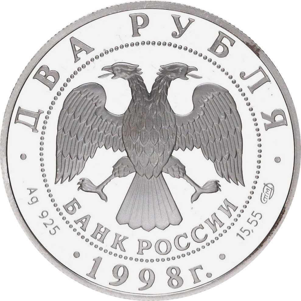 Описание: У центрі — емблема Банку Росії (двоголовий орел, розроблений І. Білібіним), нижче — напівкругла напис «БАНК РОССИИ» (БАНК РОСІЇ), обрамлена колом з крапок, а по краю — написи: зверху — «ДВА РУБЛЯ» (ДВА РУБЛЯ), внизу — «1998», літери ліворуч позначають метал і пробу, праворуч — вміст дорогоцінного металу і знак монетного двору.