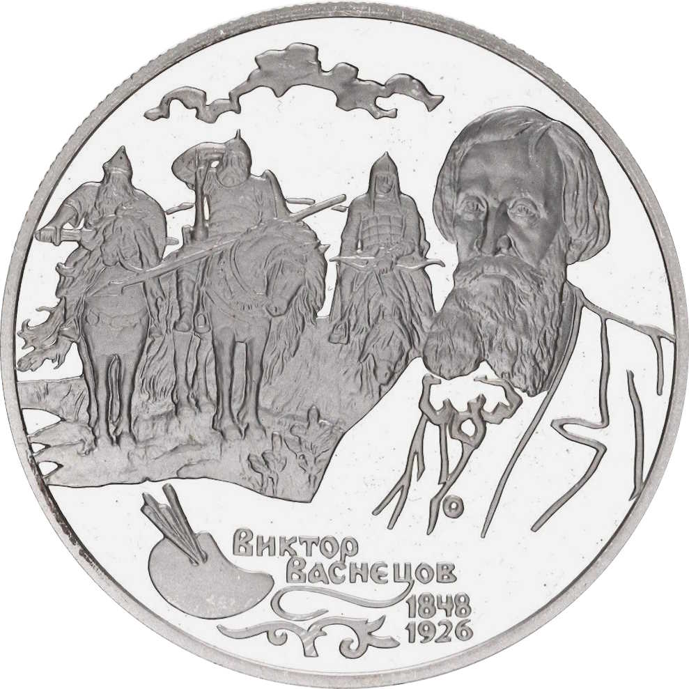 Описание: Справа — портрет В. М. Васнєцова, написаний художником М. В. Нестеровим, зліва — фрагмент картини Васнєцова «Богатирі» (воїни в стародавній Росії), внизу — палітра з пензлями, напис і дати в чотирьох рядках: «ВИКТОР ВАСНЕЦОВ», «1848», «1926».
