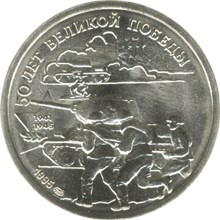 Описание: Група радянських солдатів під час танкової атаки, ліворуч — дві дати у двох рядках «1941» і «1945», лавровий гілок, знак монетного двору та рік карбування «1995 г», напис у верхній частині вздовж краю — «50 ЛЕТ ВЕЛИКОЙ ПОБЕДЫ» (50-РІЧЧЯ ВЕЛИКОЇ ПЕРЕМОГИ).