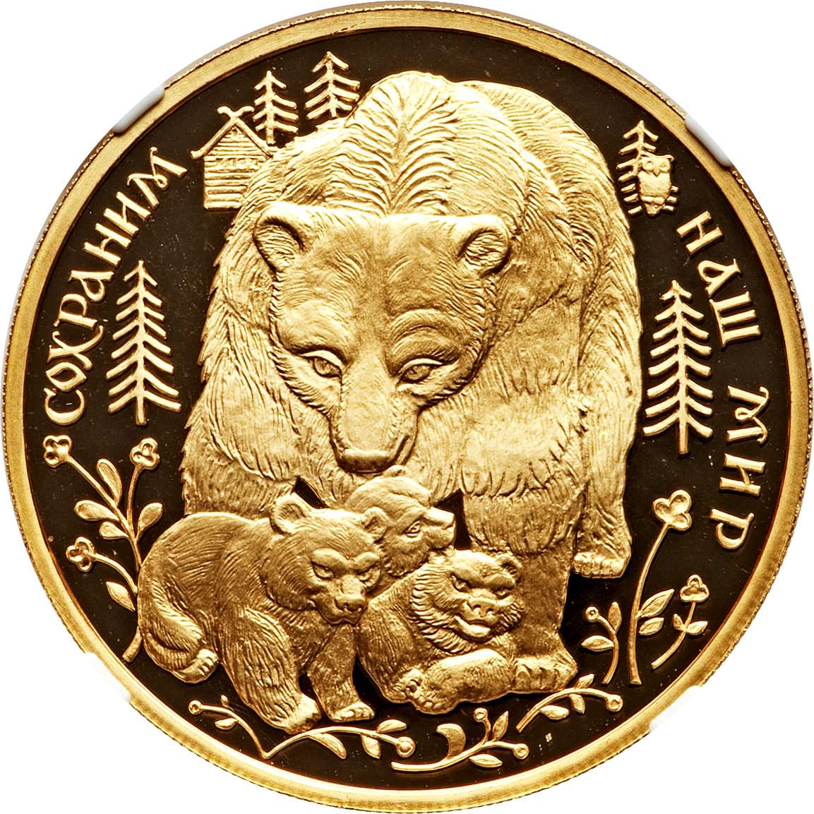 Описание: Зображення бурого ведмедя з трьома ведмежатами на тлі ялинок і трав'янистої рослинності, вгорі ліворуч — дерев'яна хатина, праворуч — сова, що сидить на гілці, по колу — напис: «SAVE OUR WORLD» (Врятуймо наш світ).