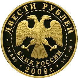 Описание: У центрі — емблема Банку Росії [двоголовий орел із розпростертими крилами, під ним — напівкруглий напис «БАНК РОССИИ» (БАНК РОСІЇ)], обрамлена колом з крапок і написів по краю — зверху: «ДВЕСТИ РУБЛЕЙ» (ДВІСТІ РУБЛІВ), нижче: ліворуч — позначення дорогоцінного металу та його проби, у центрі — рік випуску «2009 г.» (2009), праворуч — вміст дорогоцінного металу та знак монетного двору