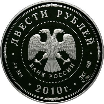 Описание: У центрі — емблема Банку Росії [двоголовий орел із опущеними крилами, під ним — напівкруглий напис «БАНК РОССИИ» (БАНК РОСІЇ)], обрамлена колом з крапок і написів, зверху — номінал: «ДВЕСТИ РУБЛЕЙ» (ДВІСТІ РУБЛІВ), нижче: ліворуч — позначення дорогоцінного металу та його проби, у центрі — рік випуску «2010 г.». (2010), праворуч у два рядки - вміст дорогоцінного металу, знак монетного двору та порядковий номер монети №___, по краю - дві концентричні лінії з чотирма декоративними елементами.