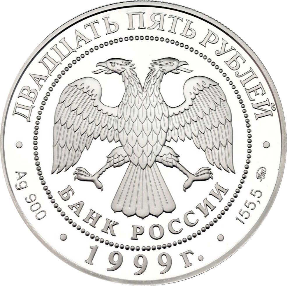 Описание: У центрі — емблема Банку Росії (двоголовий орел, розроблений І. Білібіним), нижче — напівкругла напис «БАНК РОССИИ» (БАНК РОСІЇ), обрамлена колом з крапок, а по краю — написи: зверху — «ДВАДЦАТЬ ПЯТЬ РУБЛЕЙ» (ДВАДЦЯТЬ П'ЯТЬ РУБЛІВ), внизу — «1999», літери ліворуч позначають метал і пробу, праворуч — вміст дорогоцінного металу і знак монетного двору.