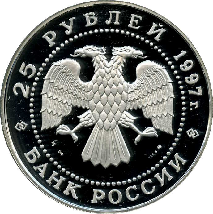 Описание: Двоголовий орел, створений художником І. Білібіним. Написи по краю: зверху — «25 РУБЛЕЙ 1997 г.» (25 РУБЛІВ 1997), знизу — «БАНК РОССИИ» (БАНК РОСІЇ). Літери нижче позначають металевий знак, пробу, вміст дорогоцінного металу та знак монетного двору.