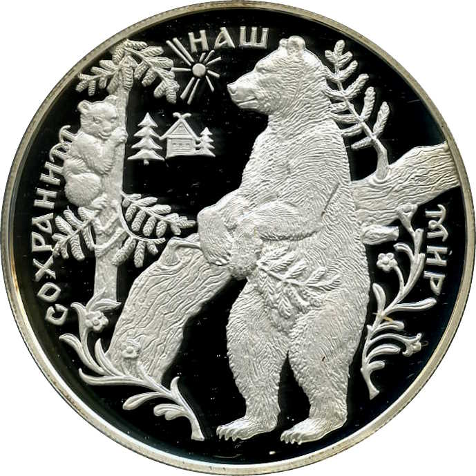 Описание: Зображення бурого ведмедя, що стоїть біля поваленого дерева, та ведмежа, що сидить на ялині, на тлі – хатина з колод, ялини та сонце. Напис по краю: «СОХРАНИМ НАШ МИР» (ЗБЕРЕЖЕМО НАШ СВІТ).