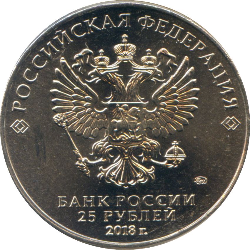 Описание: На монеті зображено рельєфний герб Російської Федерації, над ним напівкруглий напис «РОССИЙСКАЯ ФЕДЕРАЦИЯ» (РОСІЙСЬКА ФЕДЕРАЦІЯ). Є написи в три рядки: «БАНК РОССИИ» (БАНК РОСІЇ), номінал монети — «25 РУБЛЕЙ» (25 РУБЛІВ) і рік — «2018», торгова марка Монетного двору праворуч.