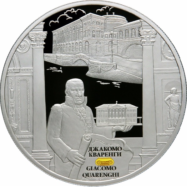 Описание: У центрі монети, в отворі між двома колонами та фрагментами інтер'єру Ермітажного театру в Санкт-Петербурзі, на частині дзеркального поля, що імітує гладку поверхню річкової води, — рельєфне зображення Г. Кваренгі з сувоєм паперу в правій руці та макет будівлі банку Асигнатів у Санкт-Петербурзі на зігнутій лівій руці. На паперовому сувої - напис у чотири рядки: «ДЖАКОМО КВАРЕНГИ» та «GIACOMO QUARENGI», розділений кольоровим зображенням капітеля іонічного ордера. На тлі - рельєфне зображення Ермітажного театру на набережній.