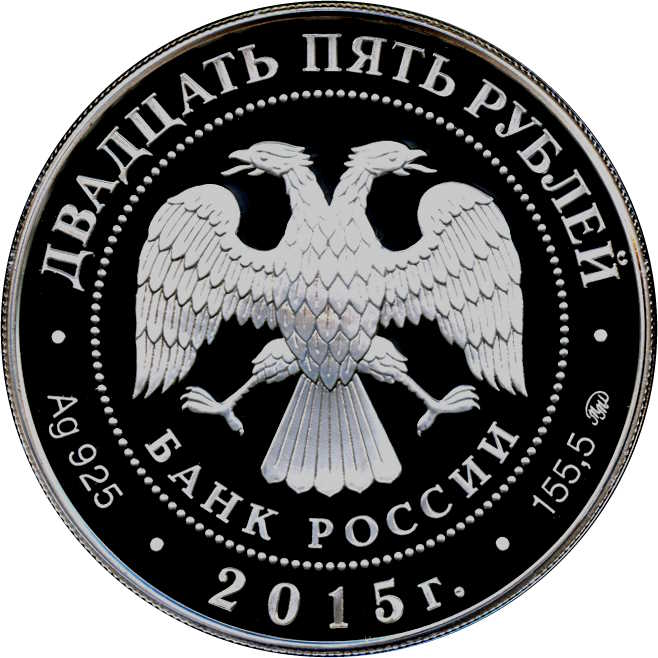 Описание: У центрі — емблема Банку Росії [двоголовий орел із опущеними крилами, під ним — напівкруглий напис «БАНК РОССИИ» (БАНК РОСІЇ)], обрамлена колом з крапок і написів по краю — зверху: «ДВАДЦАТЬ ПЯТЬ РУБЛЕЙ» (ДВАДЦЯТЬ П'ЯТЬ РУБЛІВ), знизу: ліворуч – позначення дорогоцінного металу та його проби, у центрі – рік випуску «2015 г.» (2015), праворуч – вміст дорогоцінного металу та знак монетного двору.