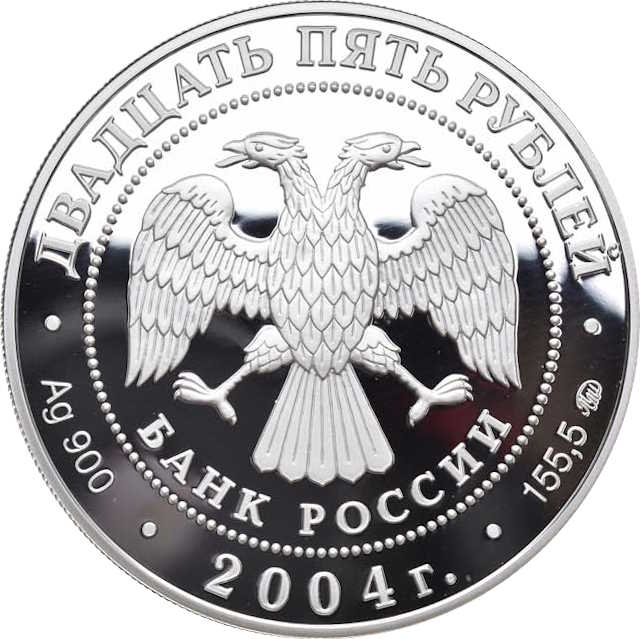 Описание: У центрі — емблема Банку Росії [двоголовий орел зі спущеними крилами, нижче — напівкруглий напис — «БАНК РОССИИ» (БАНК РОСІЇ)] в обрамленні кола з крапками та написами по краю: зверху — «ДВАДЦАТЬ ПЯТЬ РУБЛЕЙ» (ДВАДЦЯТЬ П'ЯТЬ РУБЛІВ), внизу – рік випуску «2004», літери ліворуч позначають метал і пробу, праворуч – вміст дорогоцінного металу і знак монетного двору.