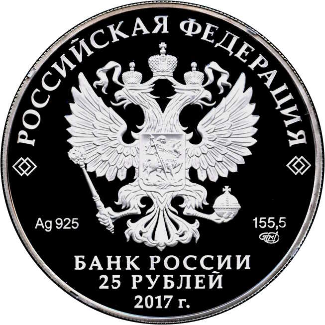 Описание: На аверсі монети зображено рельєфний герб Російської Федерації. Є написи: «РОССИЙСКАЯ ФЕДЕРАЦИЯ» (РОСІЙСЬКА ФЕДЕРАЦІЯ), «БАНК РОССИИ» (БАНК РОСІЇ), номінал монети — «25 РУБЛЕЙ» (25 РУБЛІВ) і рік — «2017», позначення металу відповідно до періодичної системи елементів Д. І. Менделєєва, проба, торгова марка монетного двору Санкт-Петербурга та вміст дорогоцінного металу.
